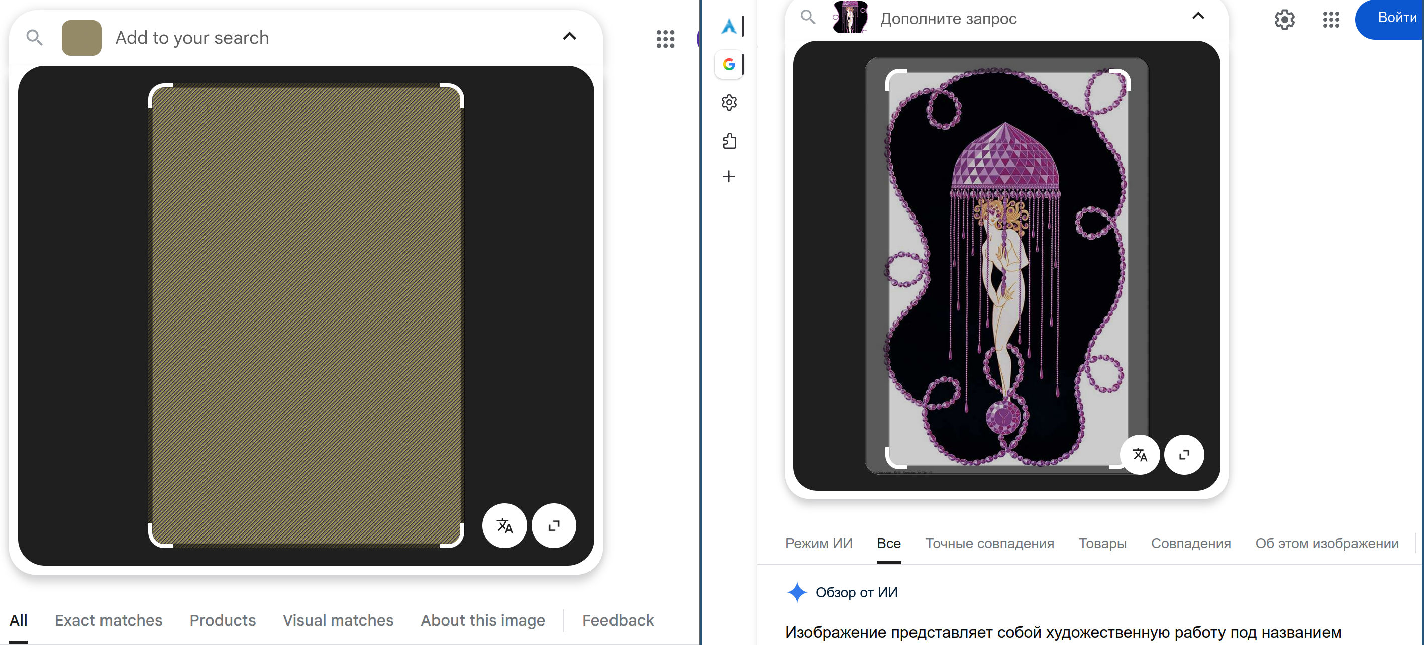 Берем одну и ту же картинку и загружаем на гуглопоиск по картинке. И одном профиле видим вместо загруженной картинки полосы. В другом все ок.