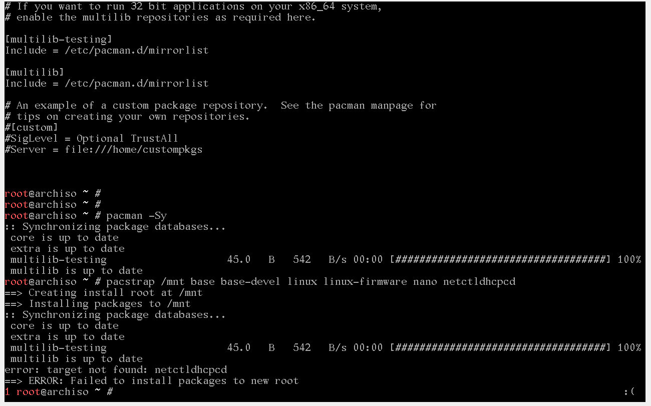 testing на этот раз не тронул, выполнил команду pacman -Syy и вот такой вывод, пожалуйста поясните из за чего, чтобы доустановить ос осталось 3-4 команды