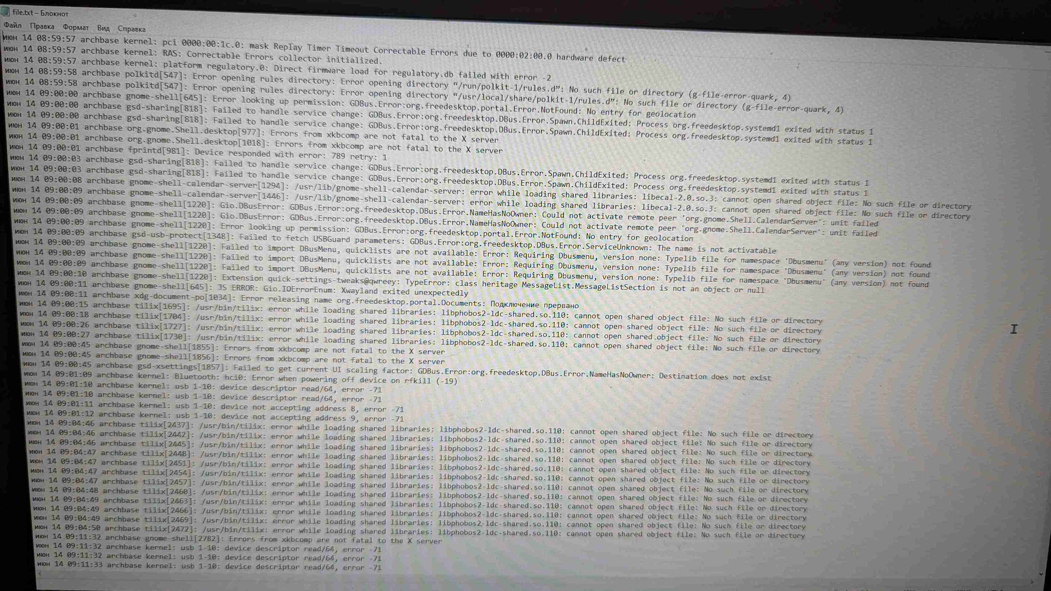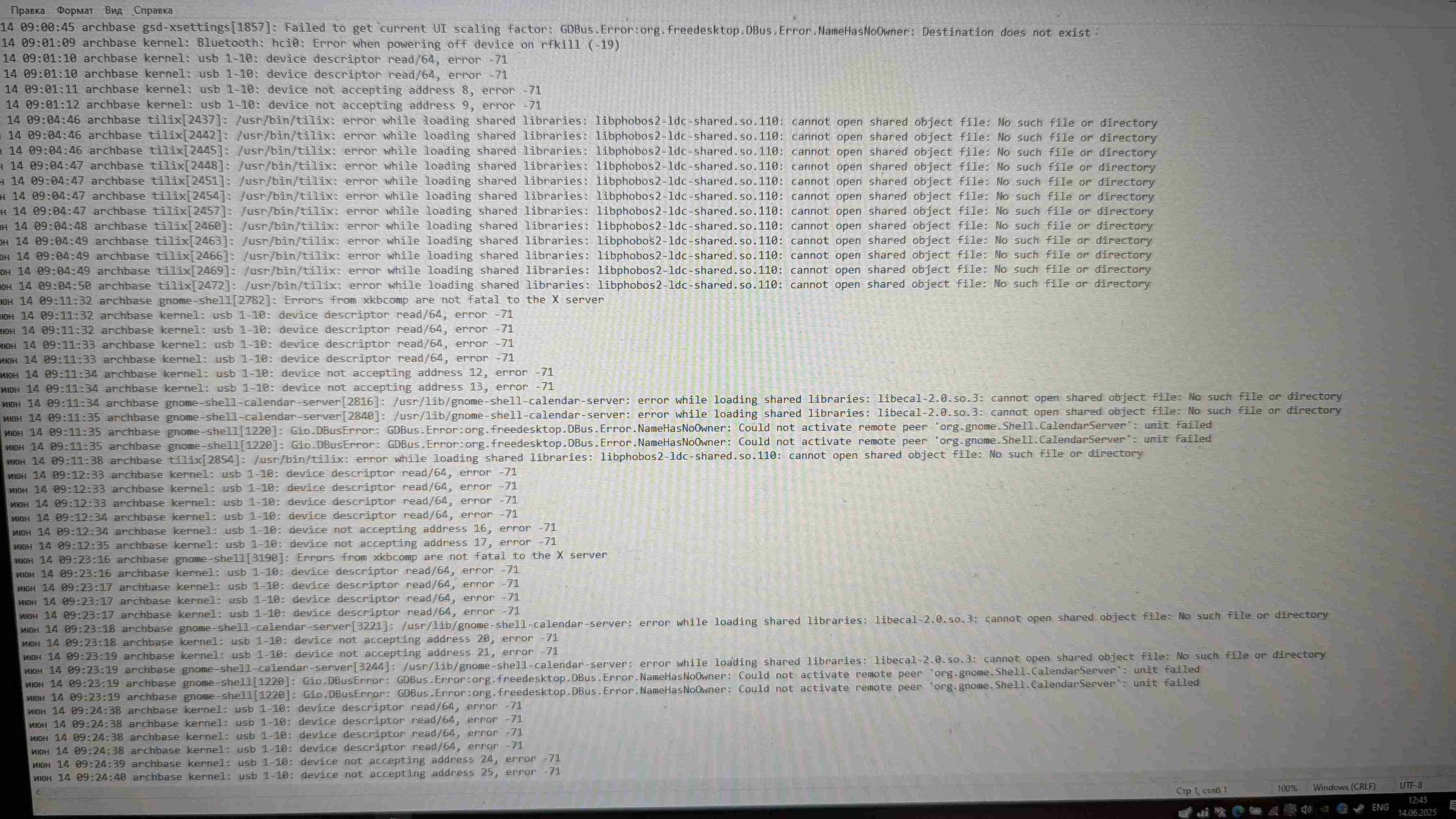 Здравствуйте, сегодня в процессе работы неожиданно зависла намертво система, после перезагрузки не работал блютуз, и не запускается терминал. Я зашёл в TTY и посмотрел текущую загрузку